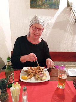 Ruokapaikan etsimisessä epäonnistuttiin. Ei ollut paljon asiakkaita, mutten ymmärrä, miksi istahdimme juuri saksalaisen lapsiperheen viereiseeen pöytään. Lapset käyttäytyivät kyllä hyvin, mutta äänekkäitä olivat. Toisessa päässä oli joukko suomalaisa lapsia ohjaajiensa kanssa. Mikä lie ryhmä. Ohjaajalla oli pieni parkuva vauva. No, syötiin ja lähdettiin. Söin kalakeittoa. Mistään tunnelmallisesta illallisesta ei ollut tietoakaan.