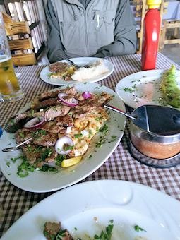 Sensijaan viereisen ravintolan isäntä oli ylipursuavan ystävällinen. Isossa ravintolasalissa istui yksi muu pöytäseurue, kaksi paikallista nuorta paria. Asetuttiin viereiseen pöytään. Katsoin, että heillä oli hyvän näköistä syötävää ja kerroin isännälle, että halutaan samaa mixed grill. Annos oli kympin arvoinen ja siitä riitti kahdelle. Oli aivan taivaallisen hyvää. Monesti grillivartaassa on ollut liha sitkeää, mutta nyt se oli kypsää ja hyvin valmistettu. Lisänä meillä oli grillattuja paprikoita.
