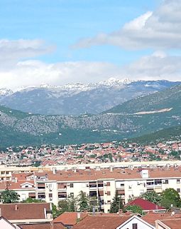 Vappupäivänäkin sateli aina silloin tällöin. Onneksi sade piti taukoja ja aurinkokin pilkisteli. Nousimme Stanicica-katuamme ylöspäin. Talot olivat siistejä ja enimmäkseen valkoisia. Autot tallien edustoilla vaikuttivat uusilta ja kalliilta. Ei mitään köyhälistöasutusta. Vihreä vuoristoalue häämötti lähellä. Montenegro tarkoittaa mustaa vuorta, mutta paljon oli kyllä vihreää. Kuljeskelimme Tivatin siistissä keskustassa. Ostettiin minulle lämpöisempää vaatetta. Pitelimme sadetta pikkuisella terassilla, jossa lämmittelimme Pelinkovacilla. Söimme modernissa bistrossa. Sain matkani parasta musakaa. Koko matkalla ei tehty itse ruokaa. Keitimme vain aamukahvit ja teetä.